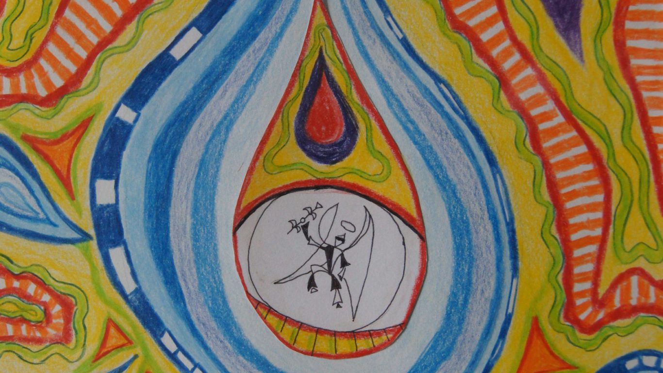 De opdracht van mijn tekenleraar (van de Zondagsschilders) was: laat je inspireren door Hundertwasser. Ik ben er begin november 2013 mee begonnen. Arthur heeft de eerste schetsen nog gezien. Ik heb het in januari 2014 afgemaakt en het maakte deel uit van de expositie van de Zondagsschilders in april 2014.
