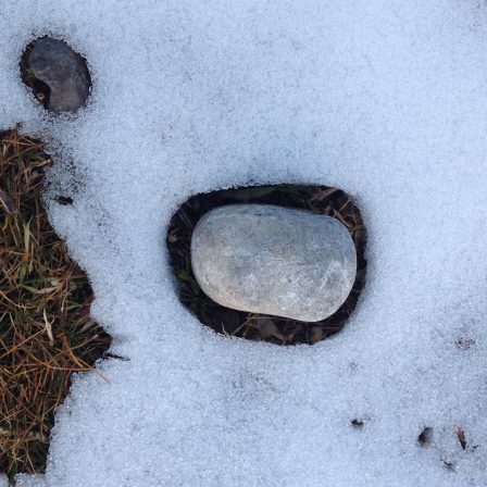Er zijn zoveel vormen van rouw: broertje, vader, moeder, zusje. De foto van de steen in de sneeuw raakt daaraan. Hij verbeeldt voor mij de warmte van de liefde. De kou om de steen heen is weg, het is een warme steen.